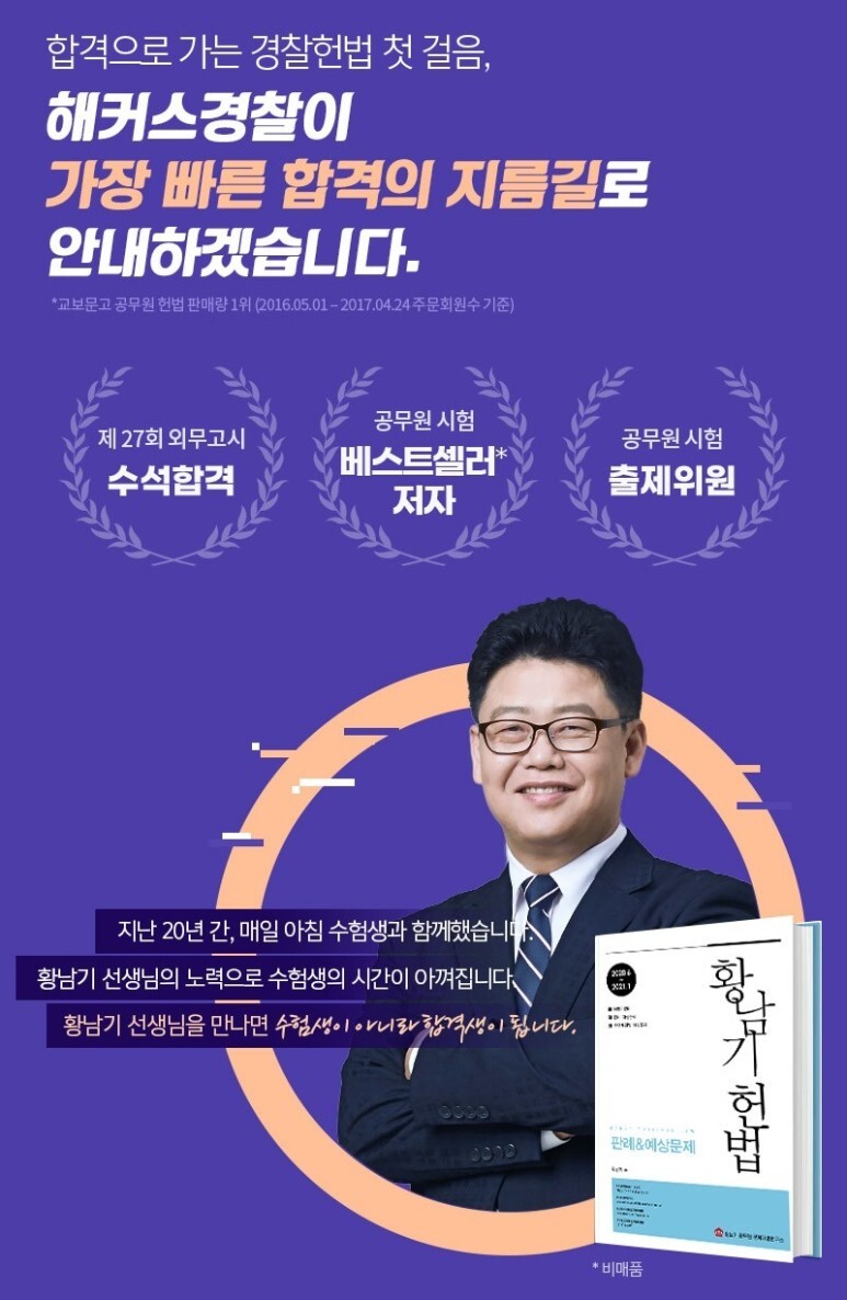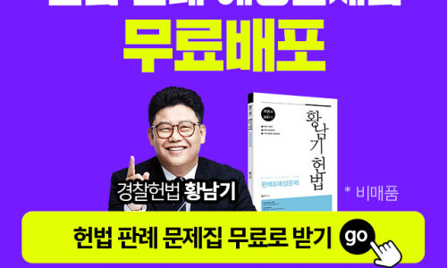 ★☆ 경수모황남기헌법판례예상문제집 ☆★ 경찰관 업무 전문성 강화를 위한 2022년 경찰공무원 시험 개편대비 ! 2022년 경찰헌법 황남기 선생님으로 시작해야 하는 이유 1.명불허전 "황남기공부법"으로 효과적인 헌법학습가능! 2.경시생들에개 낯설고 어려운 헌법을 쉬운 일상용어로 간단하게 풀이 3.수많은 법과판례! 압축강의로 부담은 최소화하고 테마특강으로 빈틈없이 해커스경찰 황남기 선생님이 엄선한 경찰공무원 수험생 필수 문제집 헌범 판례 및 예상문제집을 경수모에서 독접으로 무료배포합니다. ★3/11(금)~3/24(목) 단 2주동안만!!! 좋은 기회를 놓치지 마세요 |
