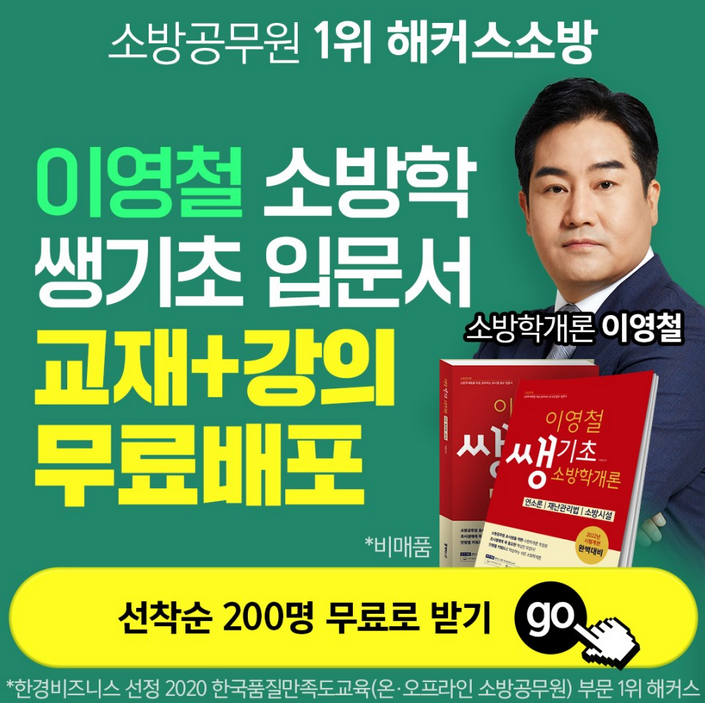 ★☆ 소방인강 소방학개론입문서+강의무료배포 ☆★ 소방관 업무 전문성 강화를 위한 2022-2023ㄴ년 소방공무원 시험 개편! 해커스소방 1타 강사 #이영철 선생님 국내 유일의 소방/방제/재난 전공자 ✔단순한 암기가 아닌 키워드로 흐름을 잡아주는 속 시원한 강의 ✔흐름 별 암기 팁으로 어려운 용어,처음 접하는 개념도 완벽하게 ✔"영철법칙" 암기비법과 수업 후 확인 점검 문제로 마무리 해커스소방 기간한정 이벤트 진행중 이영철 쌩기초 입문서 교재와 강의를 매일밤 선착순 200명에게 제공하고 있다고 해요! |